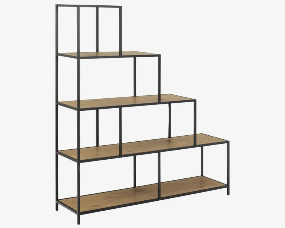 Fritstående reol i sort lakeret metal med hylder i vild eg farvet kunstfiner. Reolen er en skulptur i sig selv med sin trappe form. Det giver reolen en meget dekorativt udseende og giver et flot og anderledes look. Reolen kan selvfølgelig også stilles langs en væg.I denne serie kan der fås mange forskellige møbler, som gør det muligt at møblere de fleste rum i hjemmet med lige netop denne serie. Serien består af meget ”lette” møbler som kan give et enkelt og flot udtryk overalt i hjemmet. Flere typer sofaborde, tv-borde, reoler, serveringsvogne, skriveborde. Med denne serie er det nemt at indrette sig hyggeligt og praktisk på samme tid.• Fritstående reol.• Sortlakeret metalstel• Hylder i lys vild eg farvet kunstfiner• Dekorativt udseende• Leveres usamlet, men samles nemt• Mål i cm. B.150 x D.35 x H.135