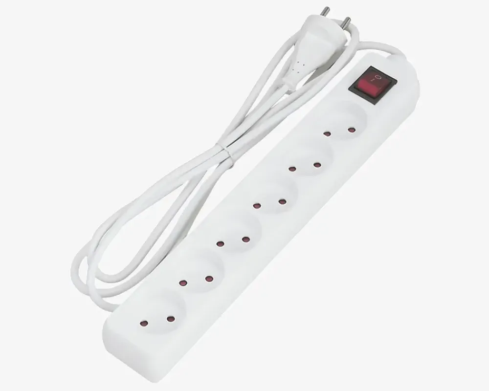 Praktisk stikdåse med 6 runde udtag, ledning og stikprop uden jordbeskyttelse. Endvidere er stikdåsen udstyret med en afbryder, så du nemt og bekvemt kan tænde og slukke for strømtilgangen.