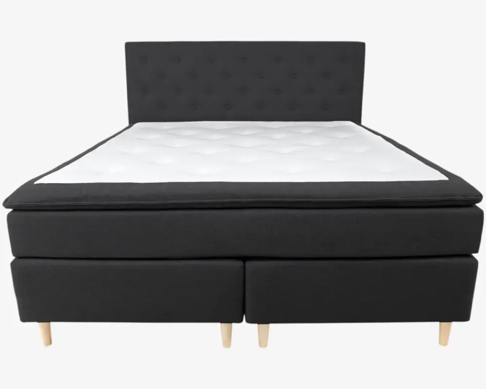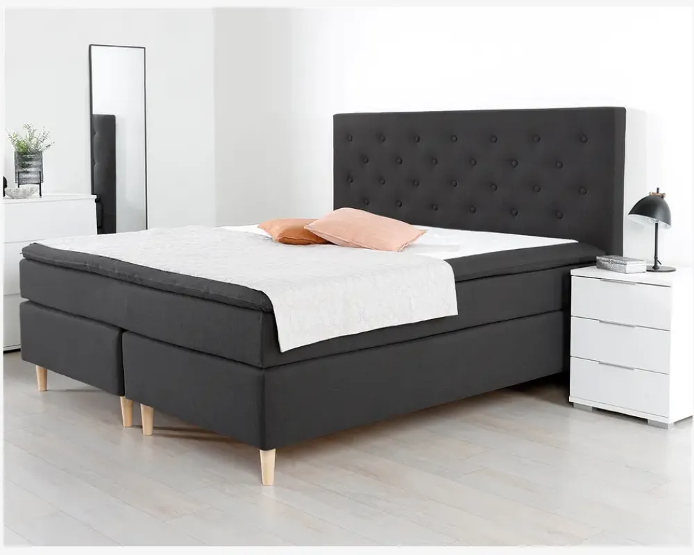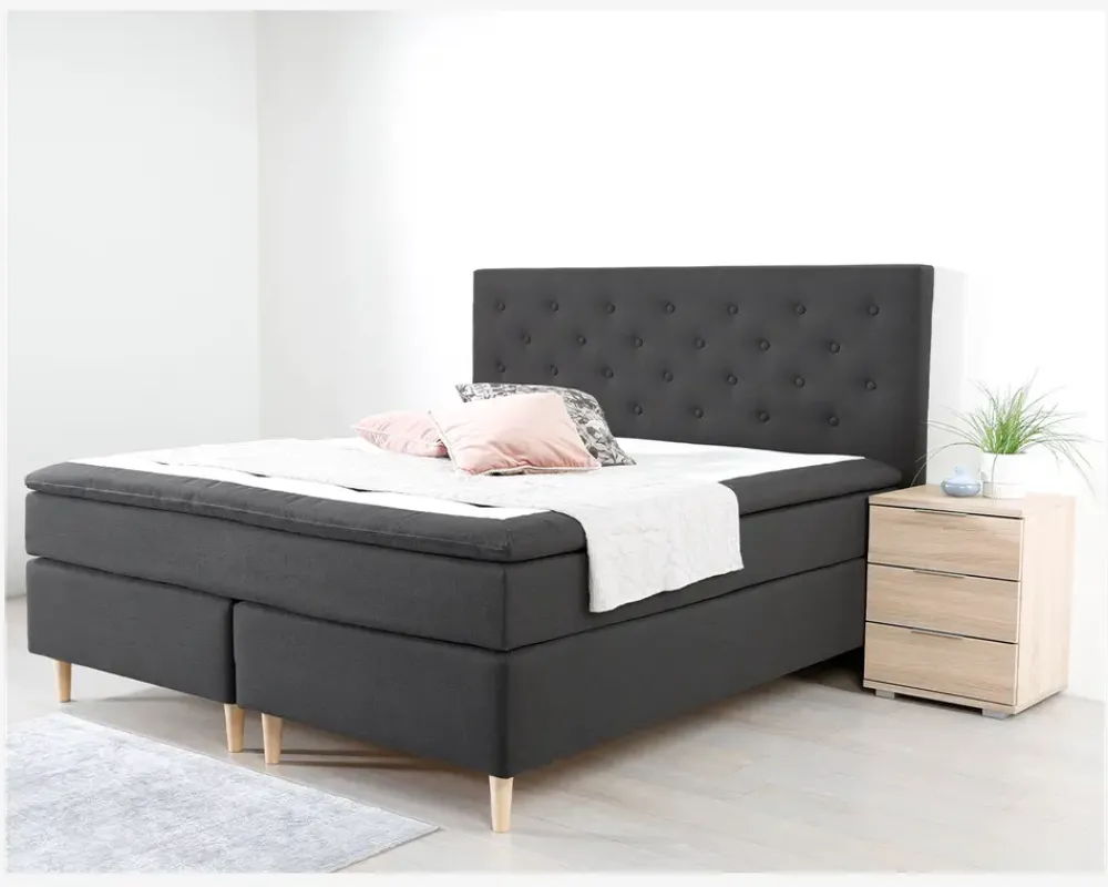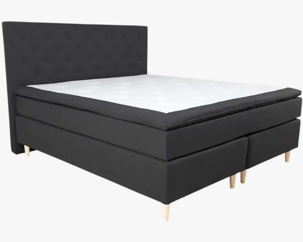 Komplet Continentalseng i et flot klassisk gråt betræk med ben i massiv oliebehandlet eg. Madras mål er 180 x 200 cm. Sengen består af 2 baser med et fjederindlæg med bonell fjedre. 1 springmadras i 180 x 200 cm med et posefjeder indlæg som er inddelt i 5 komfortzoner, til springmadrassen leveres et betræk. Topmadrassen består af en 34 kg. koldskums kerne quiltet med fibervat. Topmadrassen har nedtrækninger som sikre at fibervattet ligger fast, men det betyder også at vi kraftigt anbefaler at der benyttes en skånemadras som kan vaskes i maskinen ved 60°. Sengen leveres inkl. hovedgavl i gråt møbelstof, samt 2 sæt ben i massiv oliebehandlet eg.De 5 zoner i fjederindlægget vil understøtte din krop, og topmadrassen vil omfavne din krop, og hjælpe dig til at opnå den dybe rolige søvn, som igen vil hjælpe dig til at vågne frisk og veludhvilet hver morgen. Sengen har et flot udseende, og den klassiske grå farve vil stå rigtig flot i mange soveværelser.Sengen kræver som sådan ingen vedligeholdelse, og den daglige rengøring foretages med en støvsuger. Den øverste springmadras samt topmadrassen bør med jævne mellemrum vendes, dette vil både øge levetiden markant, ligesom det vil sikre din krop den bedst mulige støtte i hele madrassens levetid. Betrækket på topmadrassen kan ikke vaskes og vi anbefaler derfor at du benytter en skånemadras oven på topmadrassen, denne kan vaskes ved 60°, tåler at blive vasket mange gange. Derudover anbefaler vi at topmadrassen luftes udendørs nogle gange om året, dette afhjælpe eventuelle husstøvmider.• Giver en fantastisk liggekomfort• Nederste lag 105 bonell fjedre pr m²• Springmadras med 235 posefjedre pr m²• 5 komfortzoner• Topmadras med 40 mm koldskum. 34 kg.• Inkl. gavl og ben• Mål i cm. H. x B. x L.L 130 x 183 x 212• Madras mål i cm B. x L.: 180 x 200• Liggehøjde: 68 cm.• Polstring: 100% polyester• Leveres usamlet