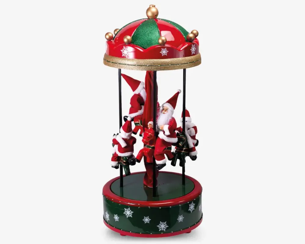 Karrusel med julemand og snemænd der har en højde på 110 cm. Karrusellen har et sammenklappeligt design og er udstyret med 114 LED-lys, der skaber en stemningsfuld og magisk julestemning. Julemanden sidder på heste og figurerne drejer rundt, hvilket giver liv og bevægelse. Leveres med 9V adapter til strømtilslutning. Forventet hjemme i uge 45.