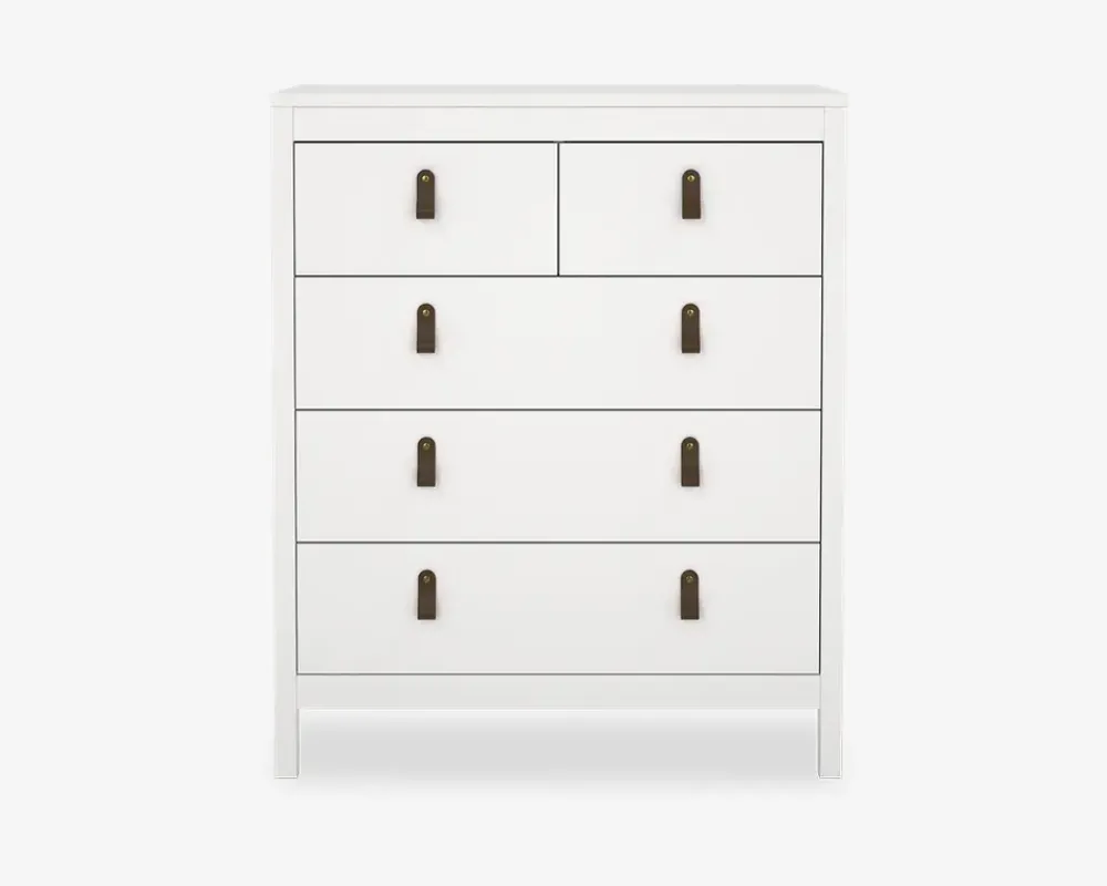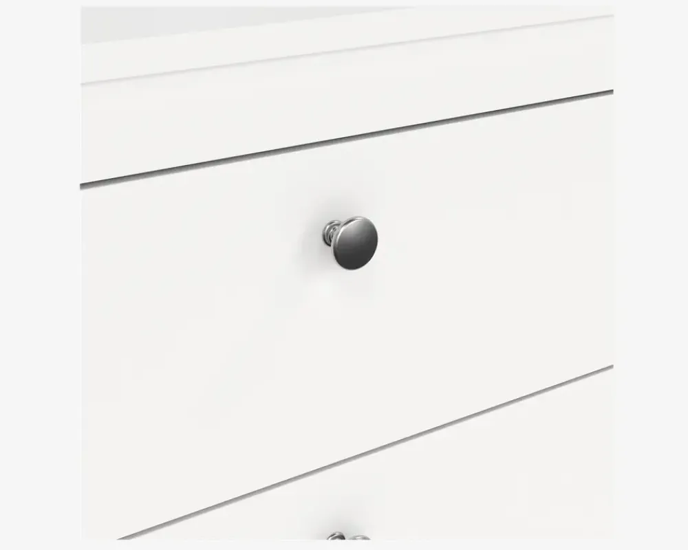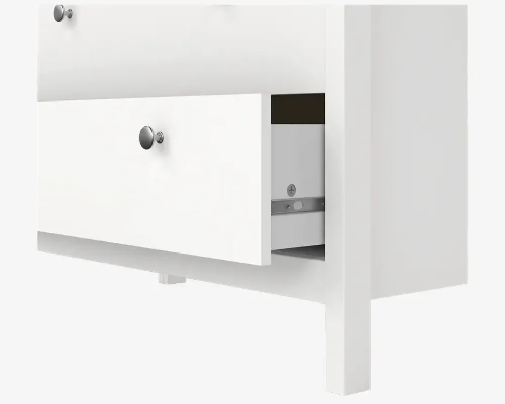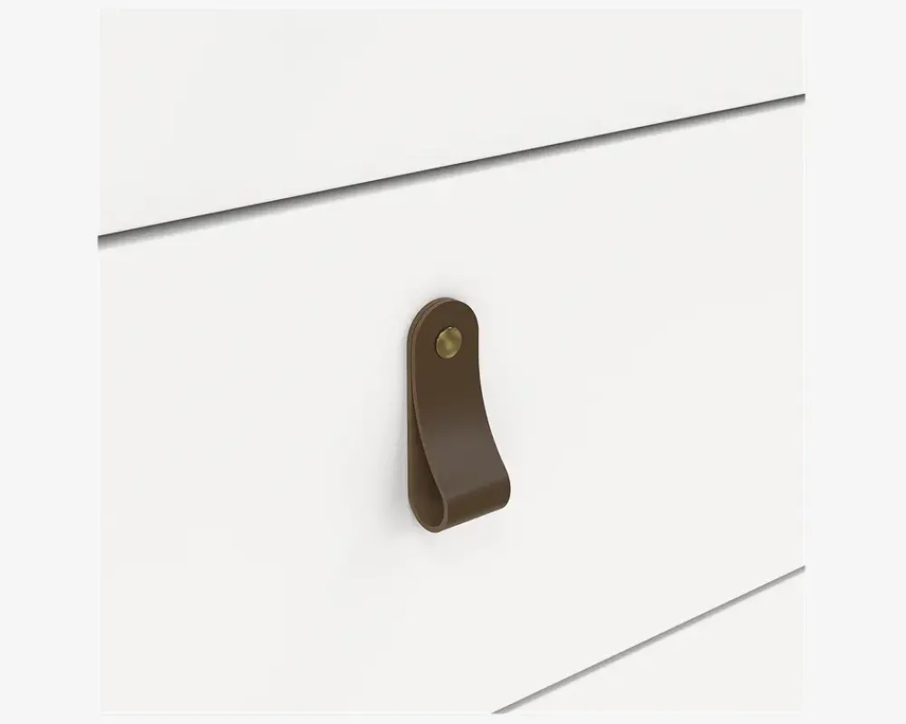 Her har du en flot dansk produceret kommodeserie, som findes i flere størrelser. Kommoden er fremstillet i hvid kunstfiner, den leveres med 2 greb henholdsvis et lædergreb eller et rundt metalgreb, hvilket du benytter er helt op til dig. Kommoden har et let kørende metaludtræk, og skufferne er rumlige og reelle, så der bliver plads til masser af tøj.Kommoden leveres usamlet, men hvis du følger den vedlagte samlevejledning og sætter lidt tid af, vil den kunne samles af alle. Hver skuffe kan belastes med 8 kg. Kommoden kræver ingen vedligeholdelse, og rengøreingen foretages med en klud vredet op i rent vand.