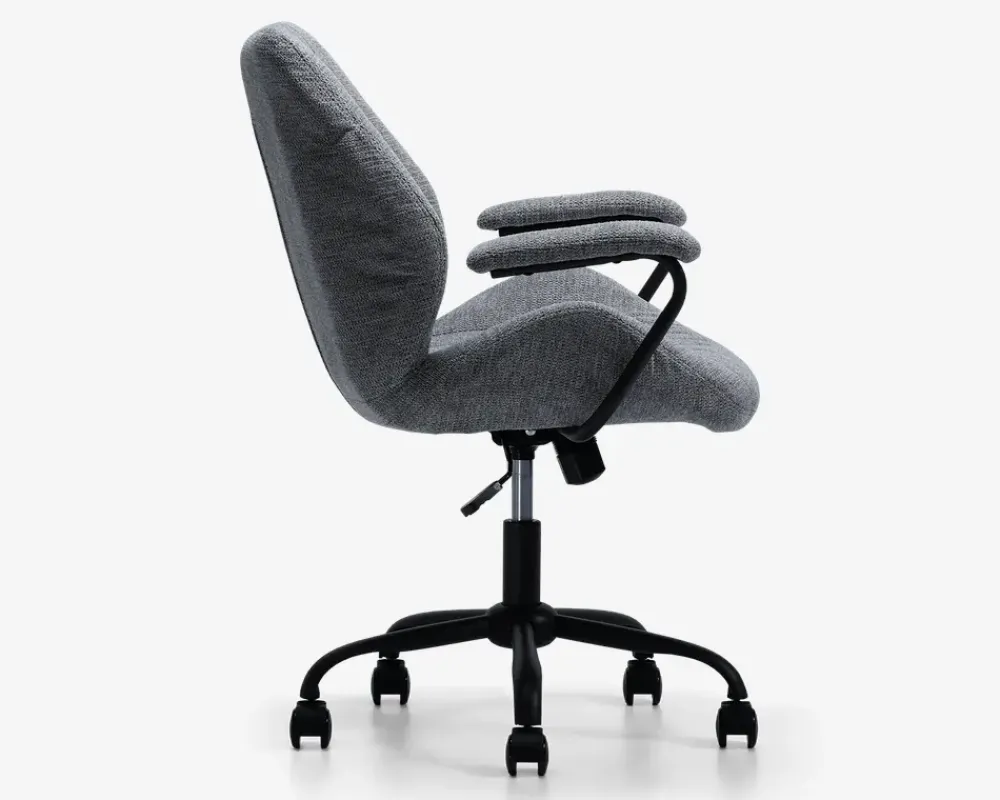 Flot kontorstol med armlæn og med vippefunktion, hvilket giver en rigtig god siddekomfort. Stolen er monteret med blødt og slidstærkt møbelstof i moderigtige farver, som passer til en del af vores sofaer. Dette giver muligheden for at få en bedre sammenhængende dagligstue med stol og sofa i samme farver. Mekanismen er gasautomatik for højderegulering og vippefunktion. Kontorstolen har en flot sortlakeret metalfod og gummihjul, så de ridser trægulvet mindre. Fås i beige og i grå.• Kontorstol med armlæn• Blødt og slidstærkt møbelstof stof på ryg• Gasautomatik for højderegulering og med vippefunktion• Sortlakeret metalfod og gummihjul• Højderegulerbar fra 44 – 50 cm• Leveres usamlet men samles let• Mål i cm. B.69 x D.68 x H.84/90