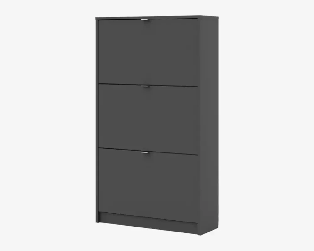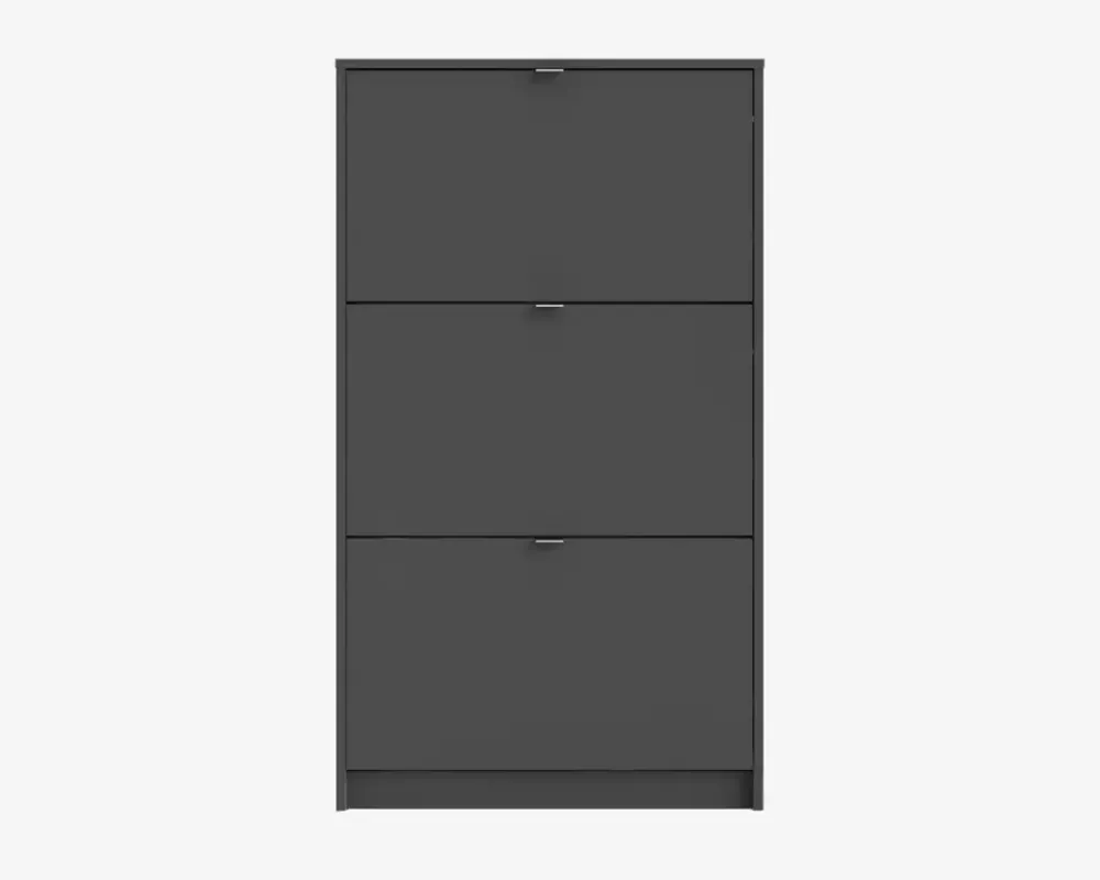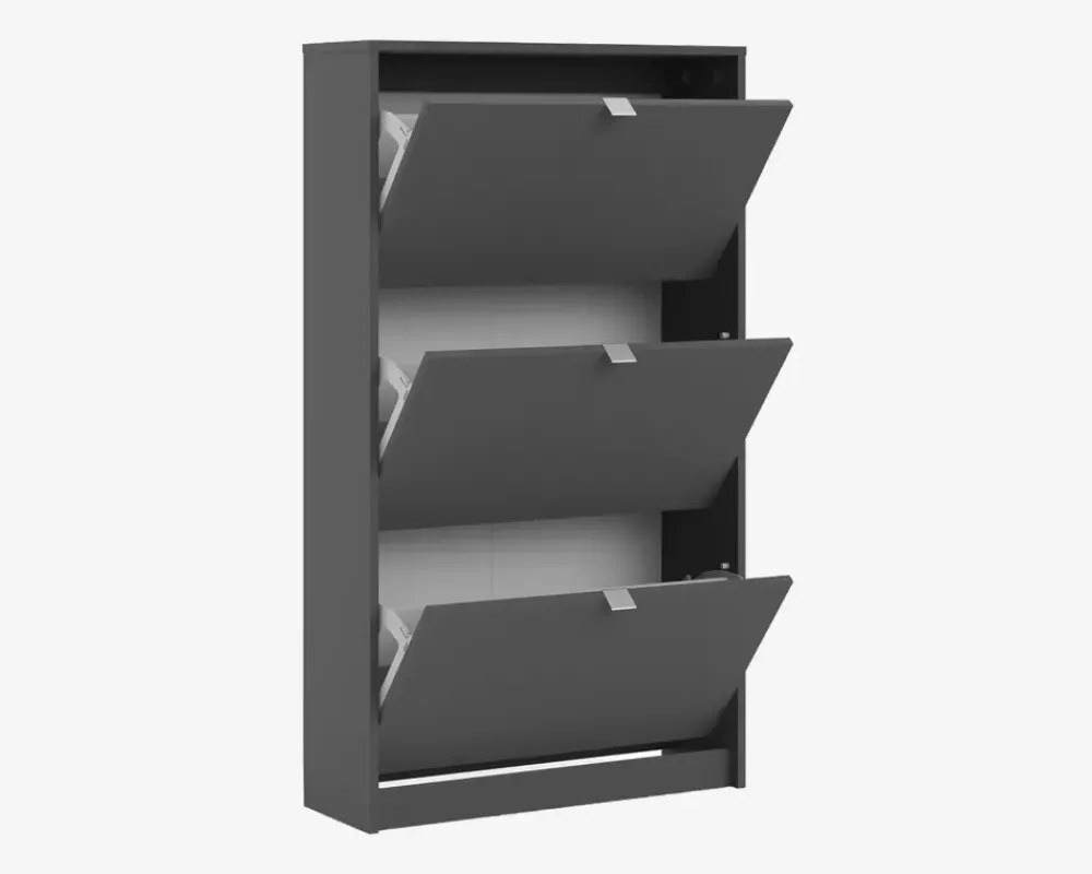 Et flot skoskab med 3 låger, som i alt giver plads til 18 par sko i varierende størrelser. Hver låge har 2 rækker, så hvis du mangler opbevaringsplads til dine sko, har du her muligheden. Skoskabet er en del af en serie bestående af skoskabe i forskellige størrelser, og de findes i flere forskellige farver, dette giver dig god mulighed for at finde en der passer hjem hos dig, uanset om det er størrelsen eller farven du ønsker at passe ind.Skoskabet er fremstillet i grå kunstfiner, som nemt rengøres, med en klud vredet op i rent vand. Der skal ikke bruges rengøringsmidler, er du uheldig og få et sål mærke på skabet, kan denne fjernes med en lille smule husholdningssprit på en klud. Sten og jord vil ridse skuffen indvendigt. Vi anbefaler grundet den lille dybde på skabet at det fastgøres til væggen, på den måde sikre du at skabet ikke vælter når du åbner den øverste låge. Skabet leveres usamlet, hvis du følger den vedlagte samlevejledning samles det nemt, men det tager lidt tid.• Findes i 3 farver• Findes i 3 højder• Mål i cm.: H.123,6 x B.70,3 x D.24,05• Leveres usamlet