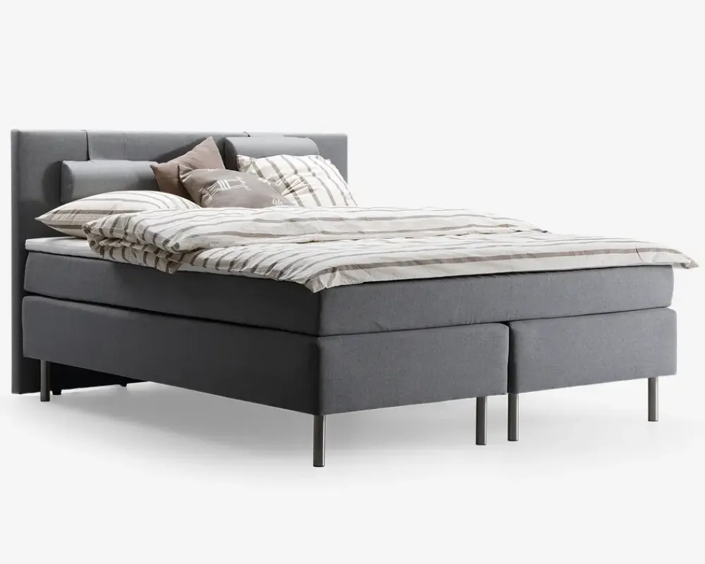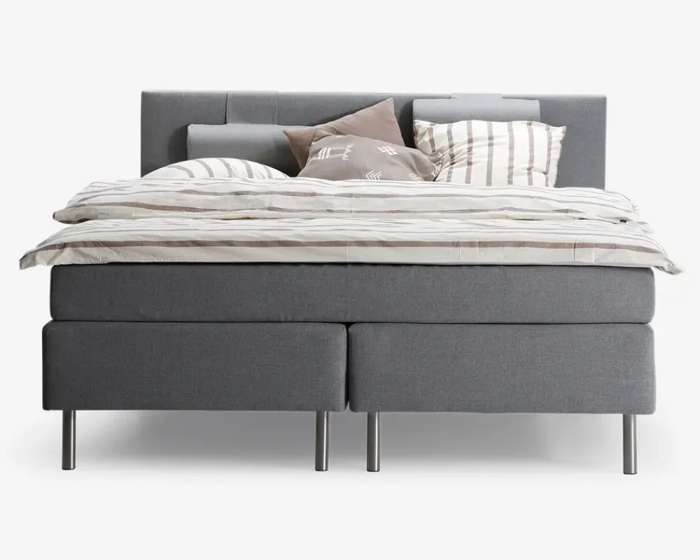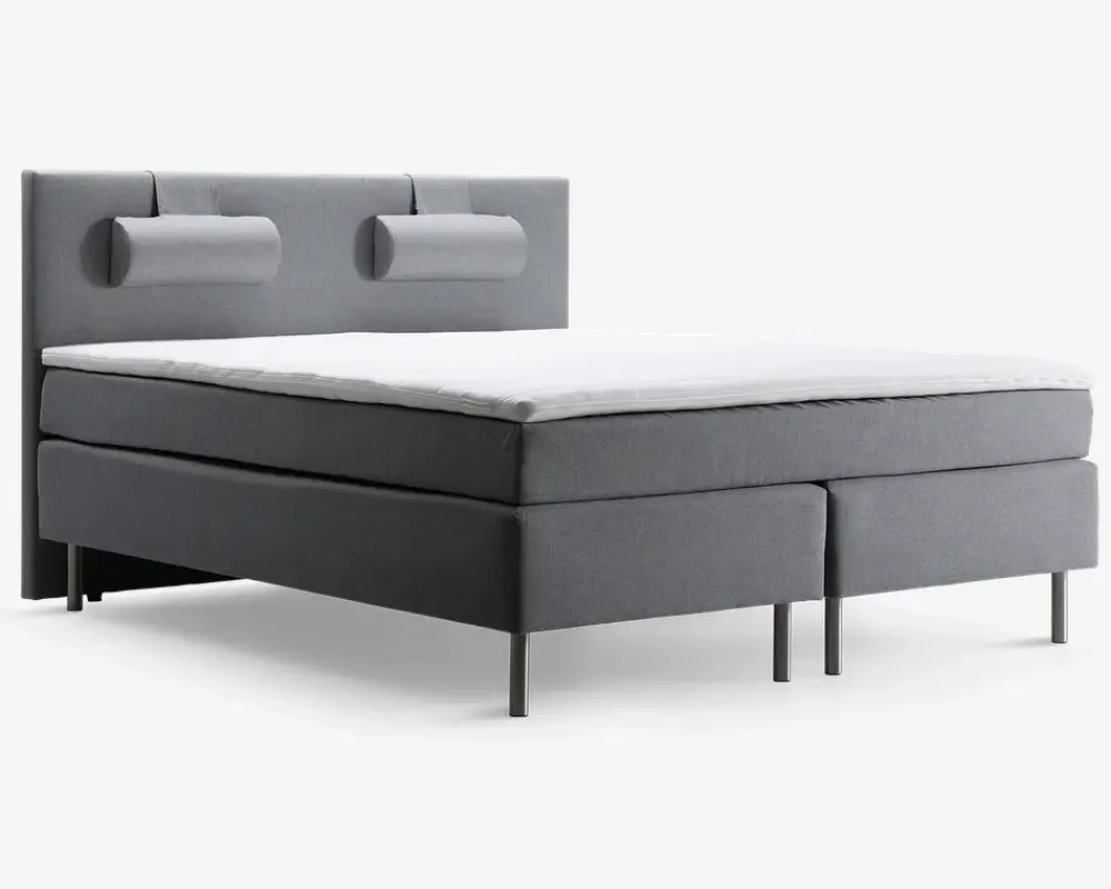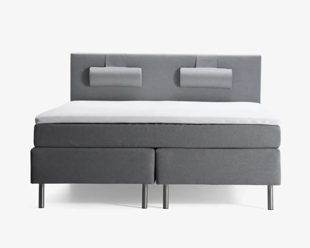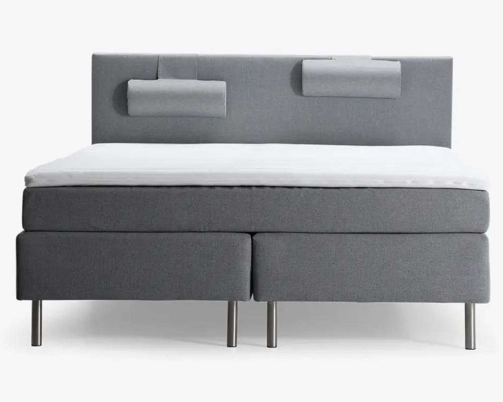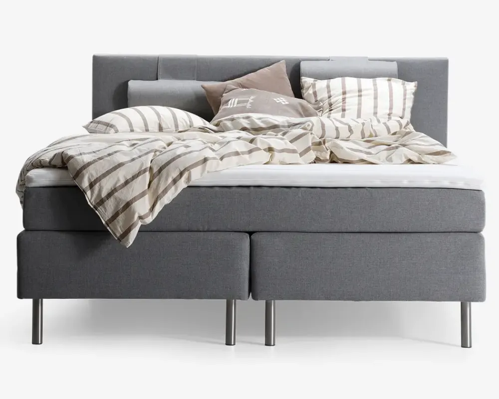Her får du en komplet continentalseng i 180 x 200 cm, inkl. gavl og bensæt. Sengen består af 2 sæt ben, 2 baser med et springindlæg med 105 bonell fjedre pr. m², 2 stk. 5-zonet springmadrasser med 250 posefjedre pr m², 1 betræk til springmadrasserne i 180×200 cm, 1 stor topmadras i 30 mm polyetherskum, med aftageligt betræk som kan vaskes ved 30°. Derudover medfølger der 2 bensæt i krom, en hovedgavl samt 2 nakkepuder, kort sagt en komplet seng klar til brug, når du har samlet den. Sengen vil med den lyse grå farve passe ind i mange danske hjem, og de neutrale farve, gør det nemt at få den trukket ind i netop din stil.Betrækket til springmadrassen giver dig følelsen af at I ligger på en stor madras, men du har fordelen og holdbarheden fra 2 mindre madrasser. De 250 posefjedre pr. m² er inddelt i 5 komfortzoner, og de vil give dig en rolig søvn, og reducerer dit behov for at vende dig, så du vil vågne frisk og veludhvilet hver morgen. For at holde madrassen frisk og sikre at I hele tiden får optimal støtte til kroppen, anbefaler vi at I med jævne mellemrum vender selve springmadrassen, på den måde vil I både opleve en bedre støtte, og holdbarheden vil forlænges markant. Det samme gør sig gældende for topmadrassen.Sengen kræver ingen vedligeholdelse, og holdes ren med en støvsuger, samt en klud vredet op i rent vand. Betrækket på topmadrassen kan afmonteres og vaskes i vaskemaskinen ved 30°. Efter vask bør betrækket monteres igen mens det stadig er en smule fugtigt, på den måde vil det strække sig igen.• Inkl. bensæt, hovedgavl, nakkepuder, 2 baser, 2 springmadrasser, betræk til springmadrasser samt topmadras• Medium hårdhed• 5-zonet springmadras med 250 posefjedre pr. m²• Madrasmål i cm: B.180 x L.200• Totalmål i cm: H.124 x B.180 x L.210• Leveres usamlet