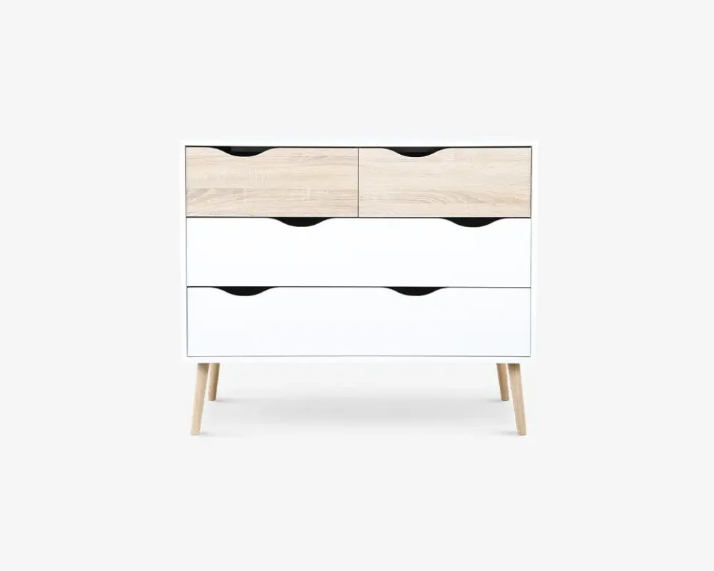 En elegant kommode der er fremstillet i hvid med skuffer i eg kunstfiner.Kommoden giver god opbevaringsplads, og kan både bruges i soveværelset og i børneværelset. De 4 rummelige skuffer kører alle på metaludtræk, således at skuffen ikke kan trækkes helt ud, og falde på gulvet. Kommodens moderne design, vil betyde at den kan masse ind i mange forskellige indretninger.Kommoden er en del af en stor serie af møbler, som har et moderne og smart udtryk, serien er fremstillet i rengøringsvenlige materialer, og kan både som enkelt møbel og som serie stå som et frisk pust til indretningen. Se hele det store udvalg af Delta møbler her eller i et af vores møbelhuse.• 2 brede og 2 smalle skuffer• Let design• Mål i cm.: H.81 x B.99 x D.39• Leveres usamlet, men samles let