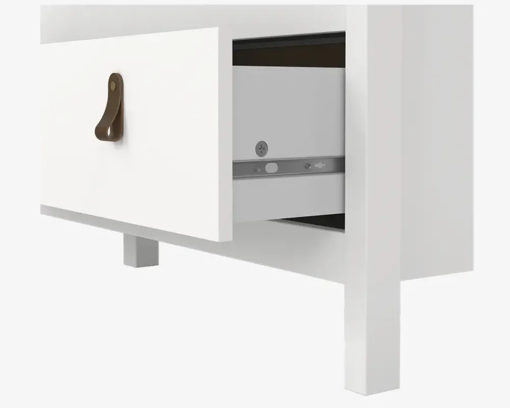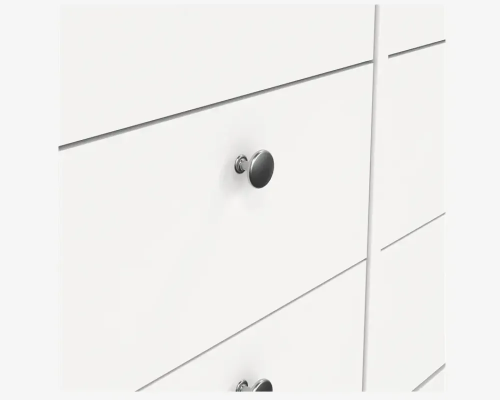 Her har du en flot dansk produceret kommodeserie, som findes i flere størrelser. Kommoden er fremstillet i hvid kunstfiner, den leveres med 2 greb henholdsvis et lædergreb eller et rundt metalgreb, hvilket du benytter er helt op til dig. Kommoden har et let kørende metaludtræk, og skufferne er rumlige og reelle, så der bliver plads til masser af tøj.Kommoden leveres usamlet, men hvis du følger den vedlagte samlevejledning og sætter lidt tid af, vil den kunne samles af alle. Hver skuffe kan belastes med 8 kg. Kommoden kræver ingen vedligeholdelse, og rengøreingen foretages med en klud vredet op i rent vand.
