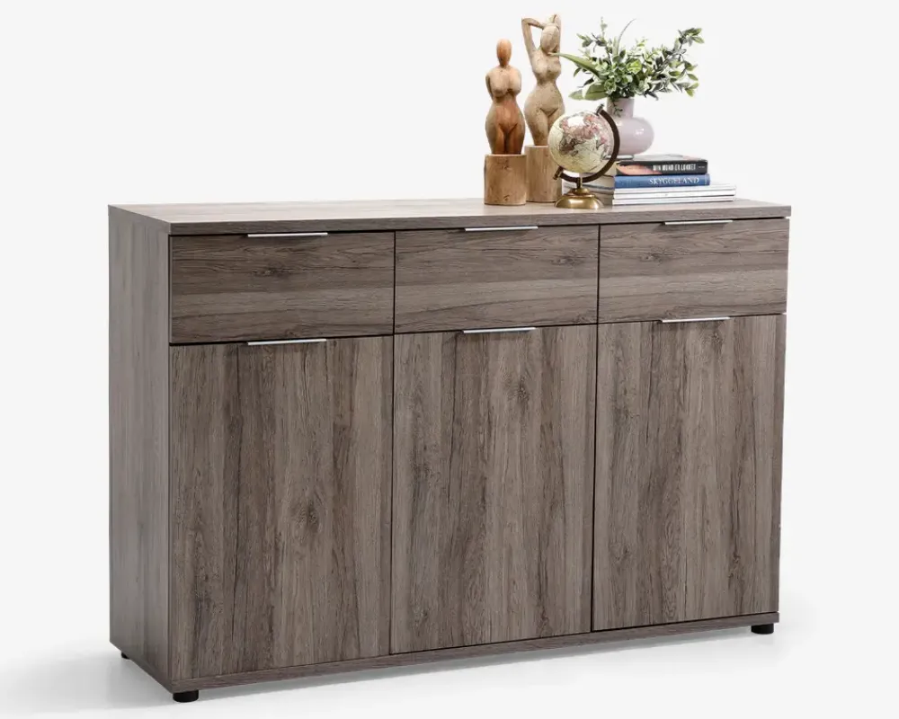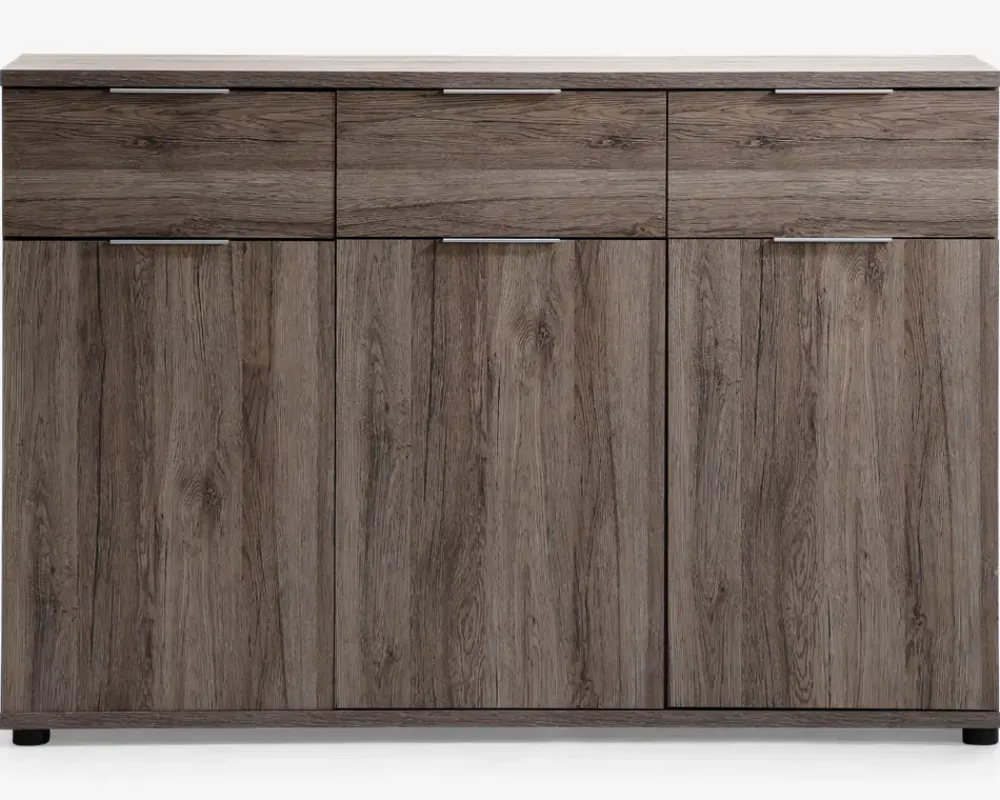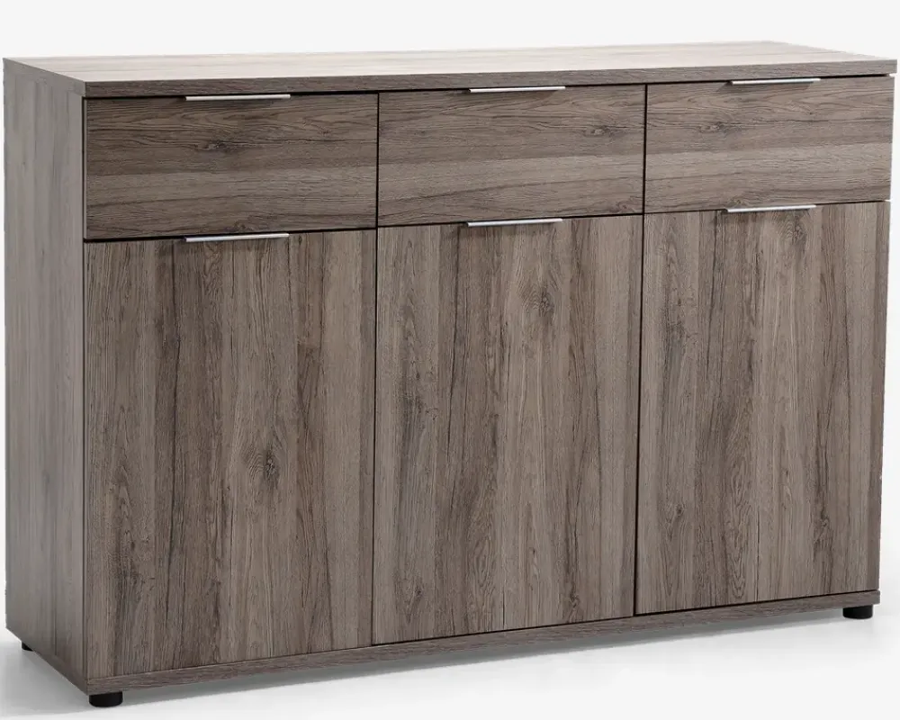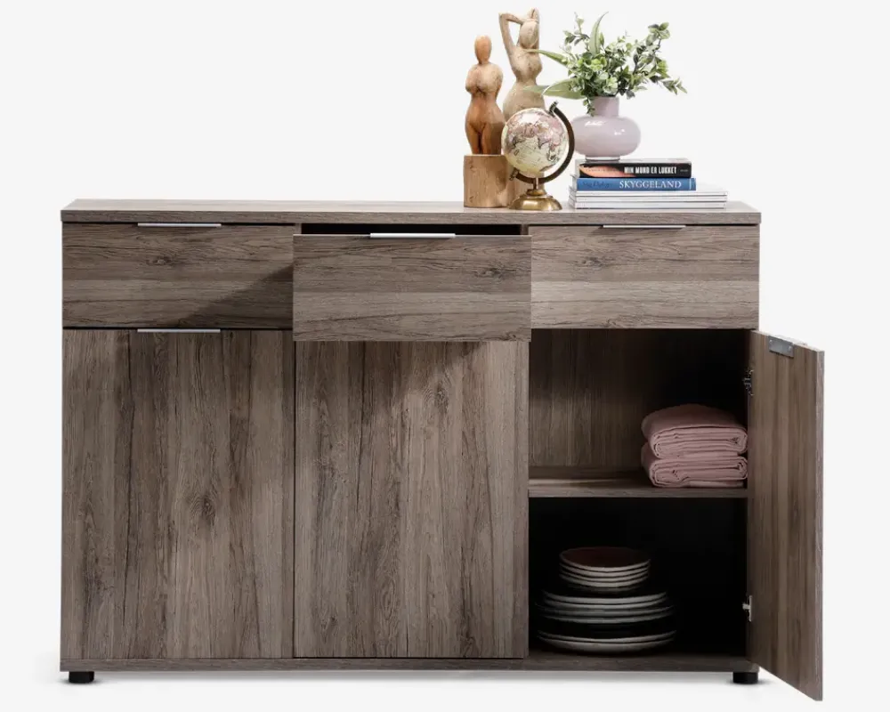 San Remo kommoden er lige velegnet om du ønsker at bruge den til at opbevare dit tøj i, eller om du ønsker at bruge den som skænk i spisestuen til bestik og dæktøj. Kommoden giver med sine 3 skuffer og 3 låger masser af plads til opbevaring. De 3 rumlige skuffer kører på kuglelejer, og bag de 3 låger er der i hvert af de 3 rum en flytbar hylde.Kommoden/skænken er fremstillet i ridsefast eg kunstfiner, som både er nemt at rengøre, og ikke kræver nogen vedligeholdelse. Kommoden leveres usamlet, men samles let• 3 skuffer, 3 låger, 3 hylder• Mål i cm: H.90 x B.135 x D.40• Leveres usamlet