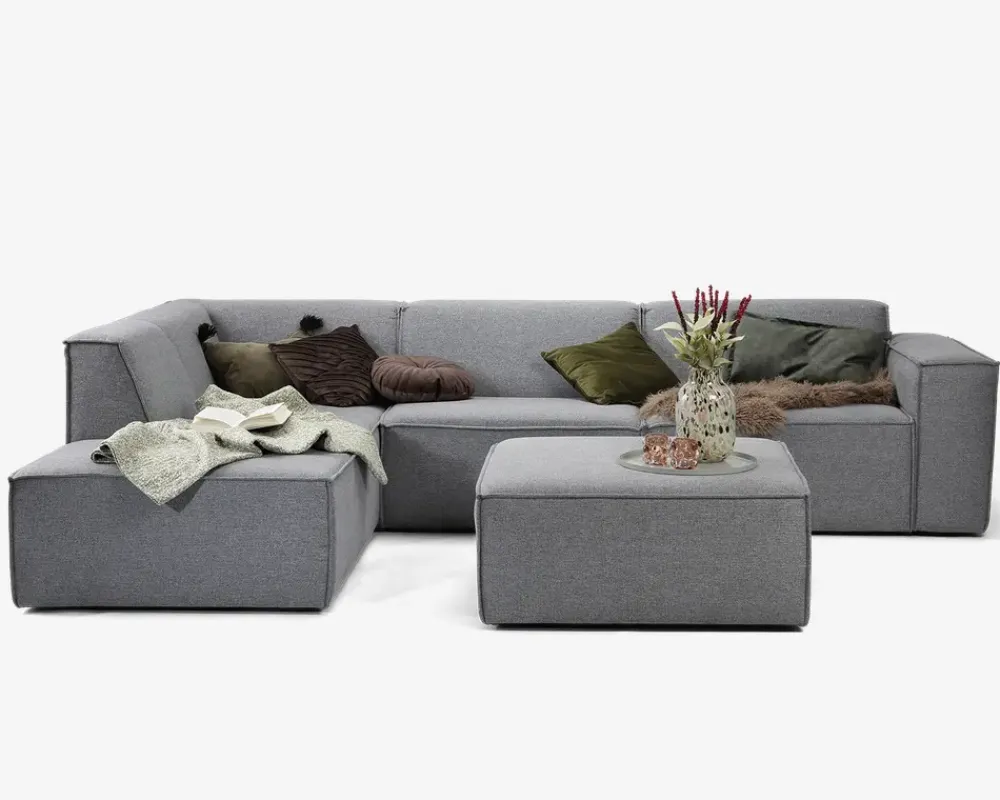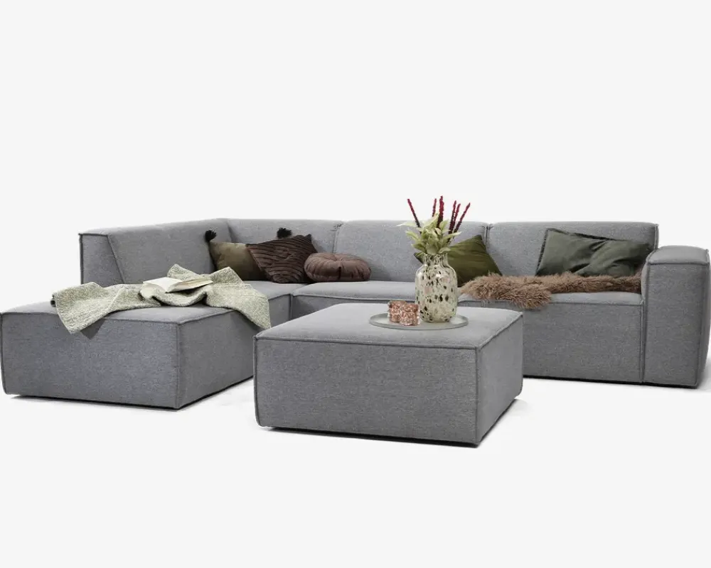 Flot designet byggesofa i en exceptionel god kvalitet. Alle moduler er betrukket med stof hele vejen rundt og beslagene til at sammensætte modulerne er skjulte, så alle moduler kan stå enkeltvis. Vælg imellem 12 forskellige moduler, som kan bestilles i 18 forskellige typer stofbetræk. Der kan også vælges imellem 3 forskellige typer indlæg i sæderne. “Comfort” skum, Koldskum eller den eksklusive med posefjedre. Så kan man opnå den helt perfekte siddekomfort. Lagerføres i den grå farve som er vist her, med “Comfort” skum i sædet.Her er vist puff, som kan stå frit eller bygges sammen med andre moduler.Klik for at se alle mulighederne og priserne• Flot designet byggesofa• “Comfort” skum i både sæde og ryg• Fantastisk siddekomfort og lang holdbarhed.• Med stof hele vejen rundt• Skjulte beslag til sammensætning• Lagerføres i grå, kan bestilles i flere farver• Mål i cm. L. 93 x D.93 x H.43
