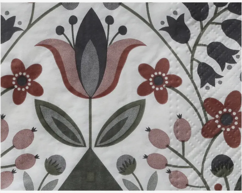 Servietter med mønster, der tilføjer et dekorativt touch til borddækningen. Servietterne måler 33 x 33 cm og er perfekte til både hverdag og festlige anledninger. De kan bruges til middagsbordet, kaffebordet eller en hyggelig sammenkomst og bidrager til en indbydende atmosfære.